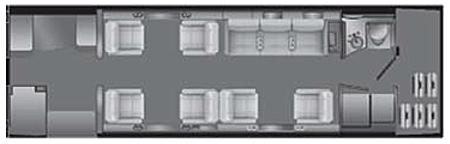 Eleven or Twelve passenger configuration with extended passenger compartment, four club chairs forward and a standard three place divan or optional four place divan opposite a four place conference group aft.